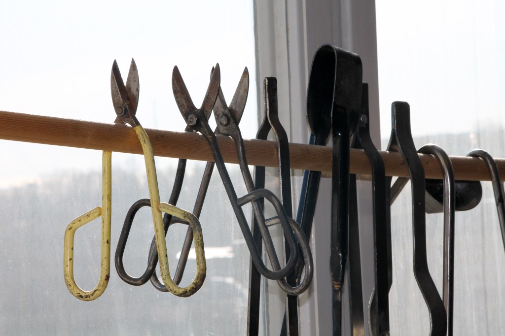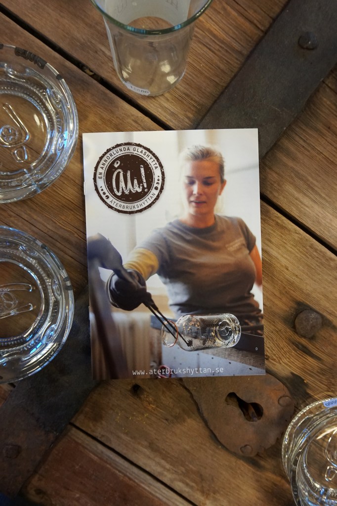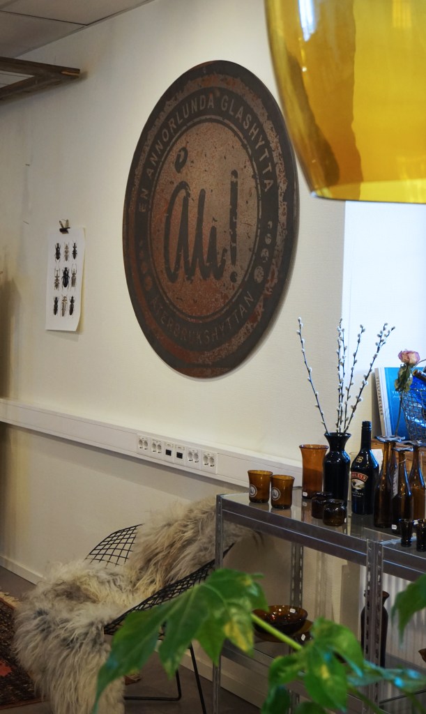 Återbrukshyttan är typ världens smartaste glashytta. Här återvinns glasförpackningar, flaskor, burkar m.m. Ett modernt hantverk med gedigen historia. I en verkstadslokal som har högt i tak, rejäla fönster och stora ytor kan jag inget mer än dregla. Butiken är inredd i en härlig blandning av gammat & nytt. Vilket gör allt så levande och roligt att titta på. Noga invalt och noga bortvalt. Jag drömmer om en keramikverkstad med anknuten butik, stora ytor och mycket volym.