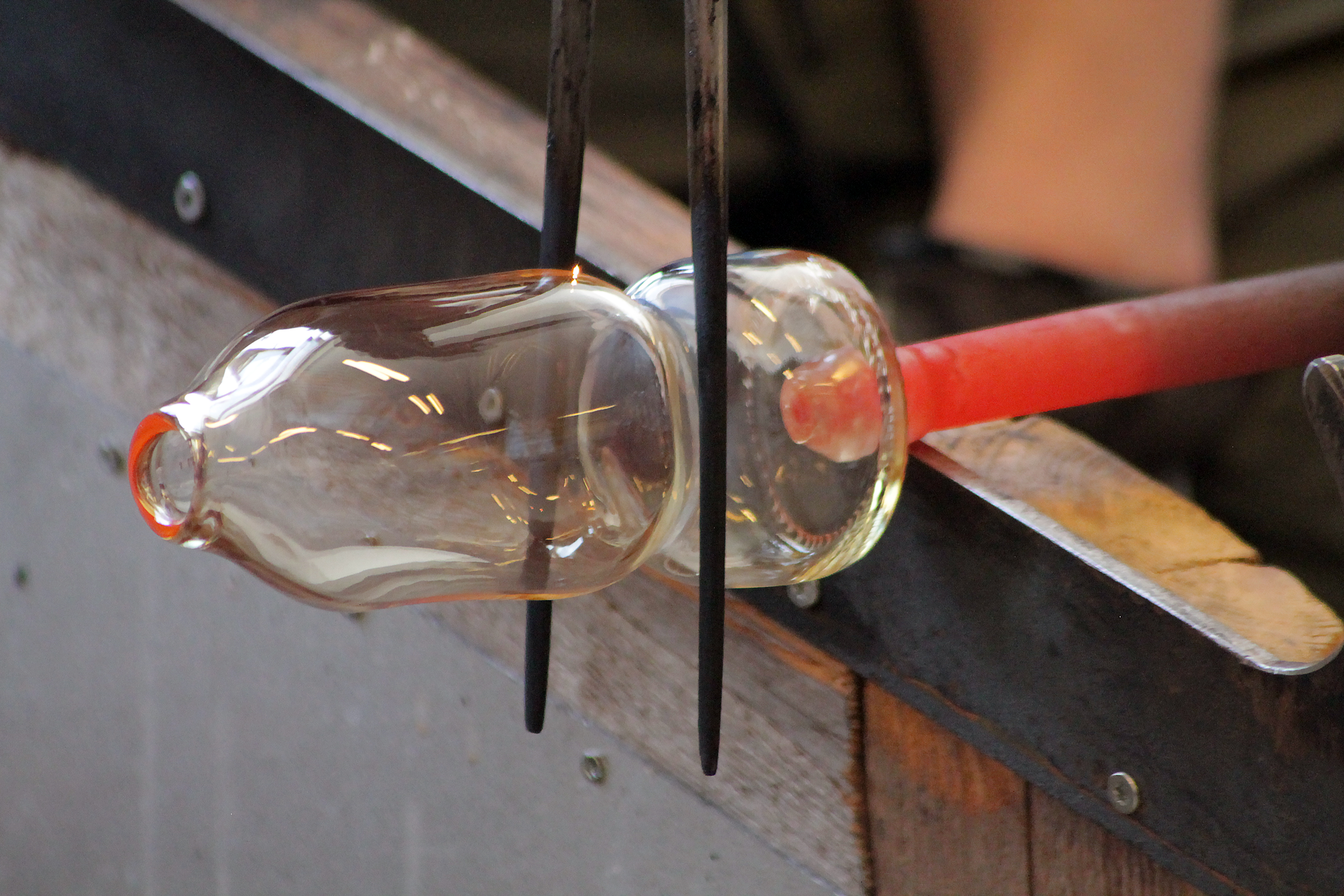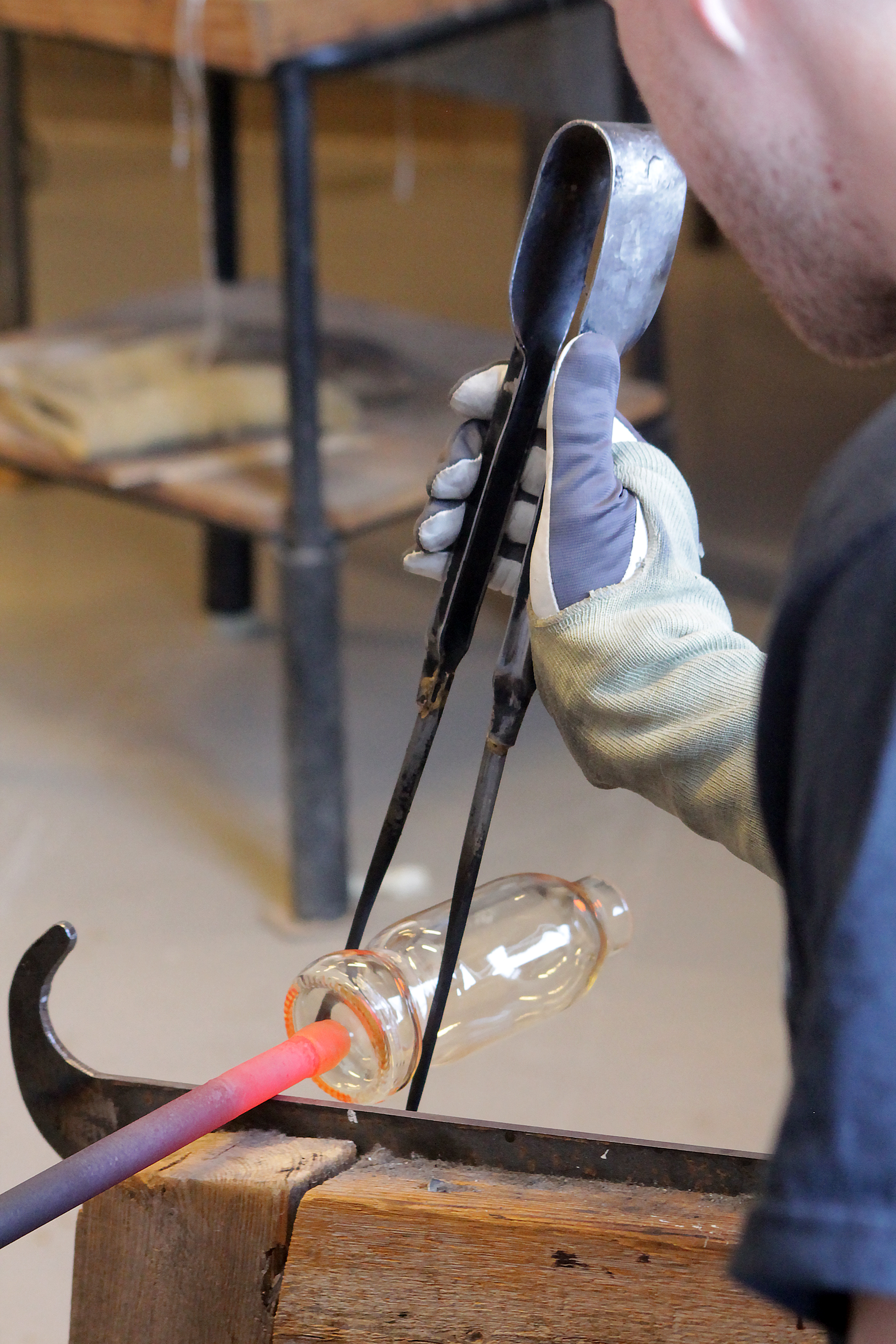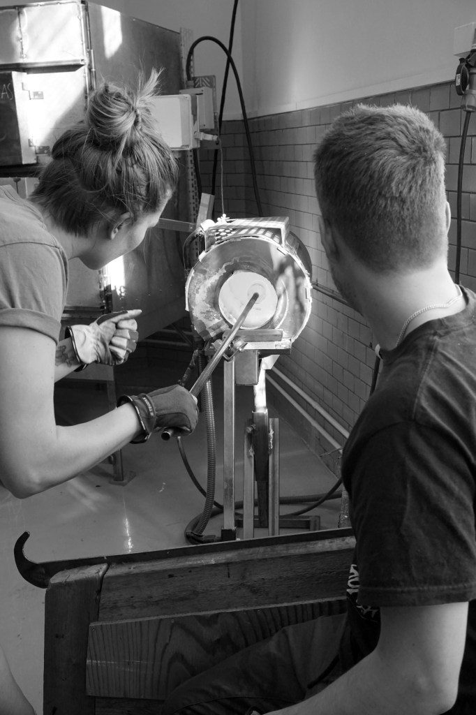 Med höga förhoppningar & fjärilar i magen startar vi kursen. Anny går igenom arbetsprocessen för att vi sedan skall testa med hjälp och handledning. Med glödande verktyg och hetta ifrån ugnen omformar vi 12st flaskor tillsammans. Flaskorna kommer ifrån ett Äppelmusteri ifrån trakten och är tjusiga i klarglas. Jag hade nog en miljard frågor om allt och inget… ugnar, entreprenörskap, lokal och mycket mer. hihi stackars Anny som verkligen inte fick en lugn stund med oss i verkstaden.
