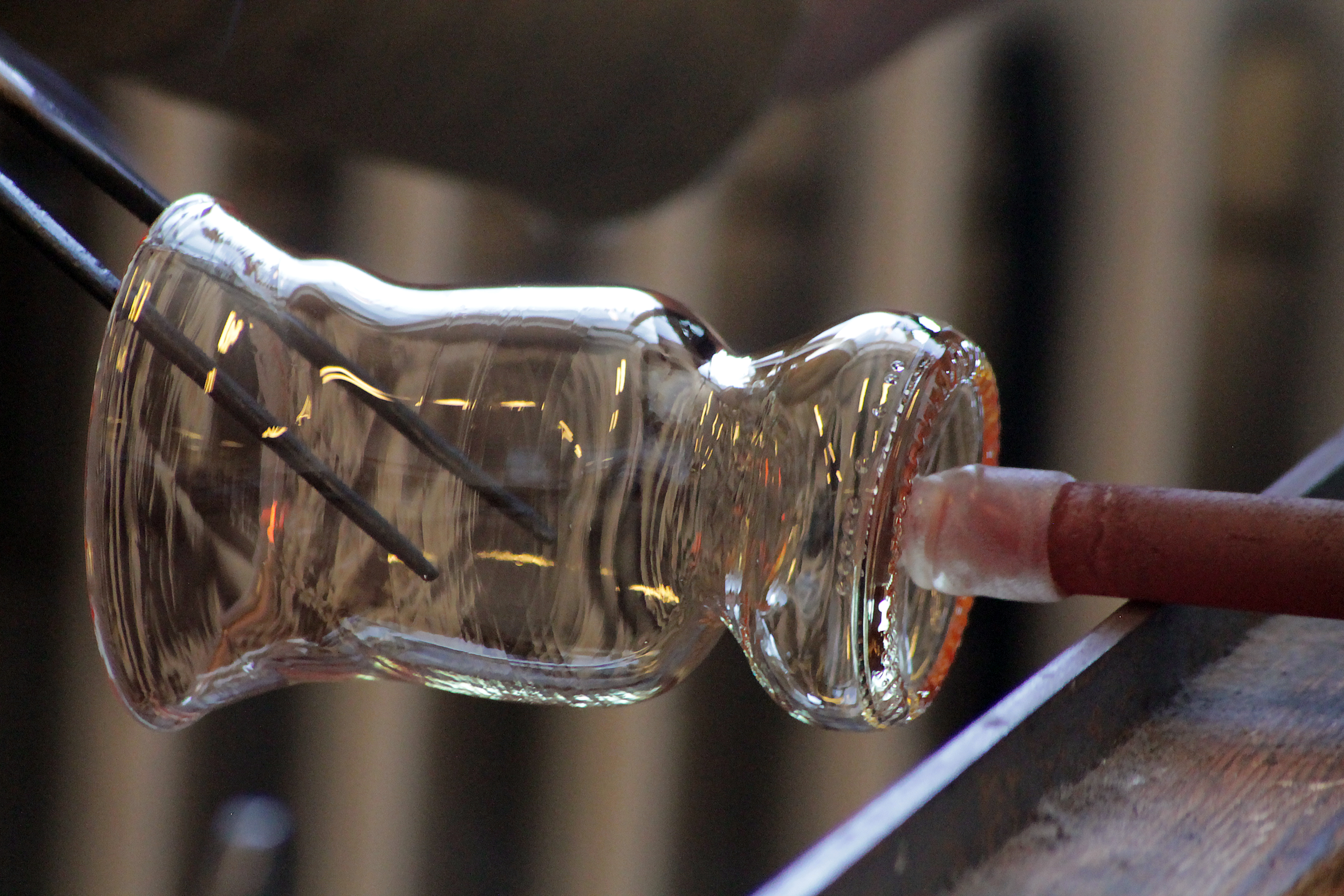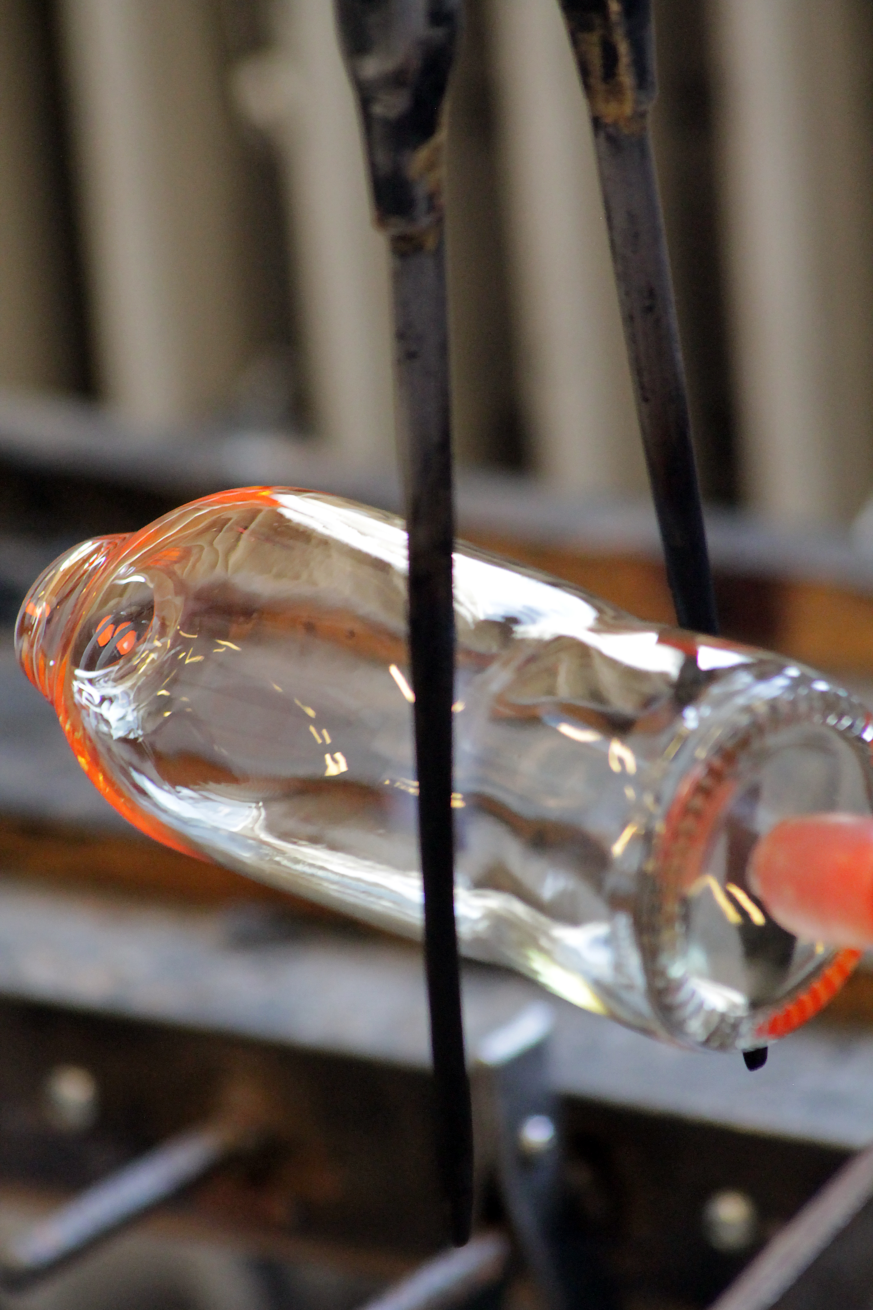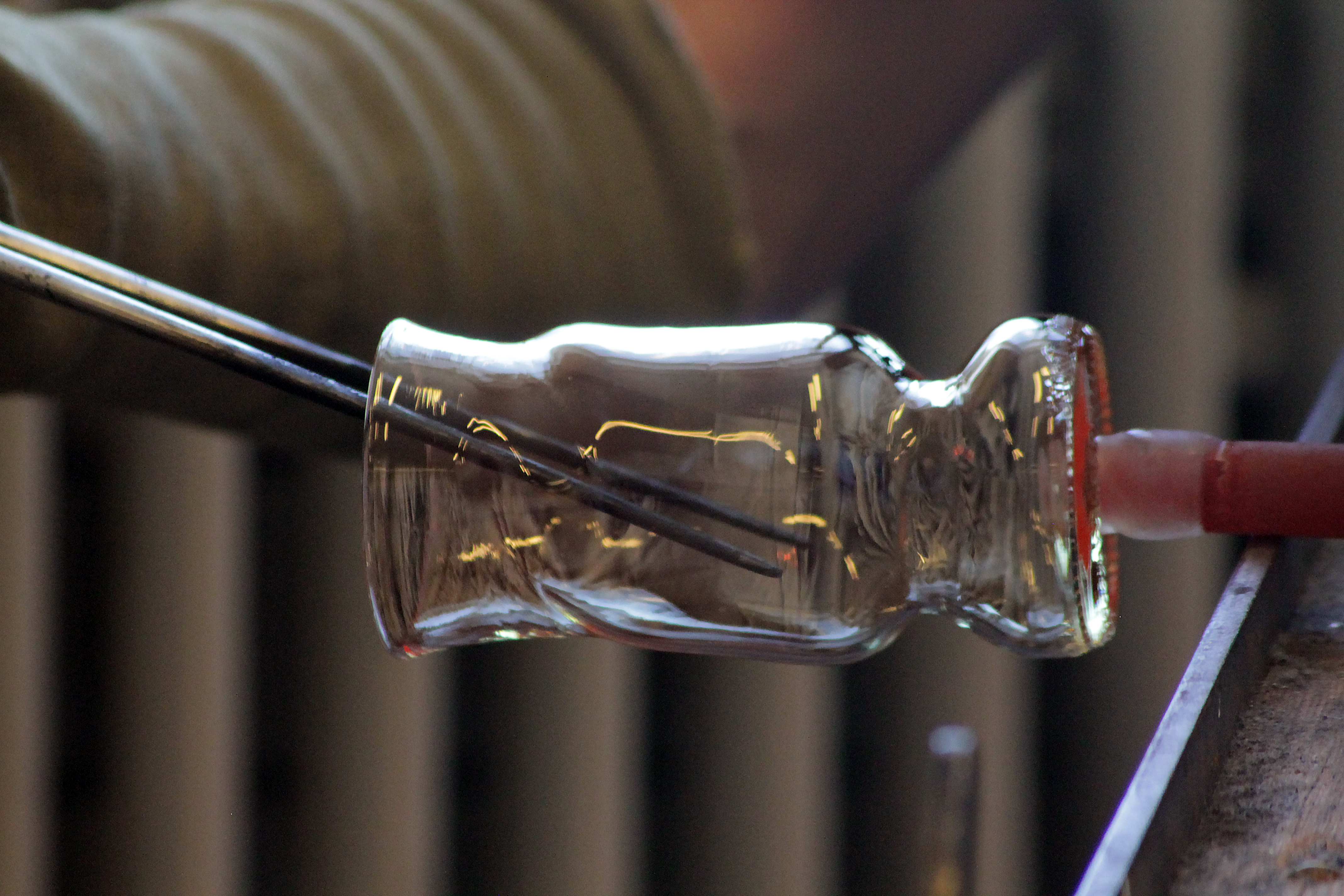 Med höga förhoppningar & fjärilar i magen startar vi kursen. Anny går igenom arbetsprocessen för att vi sedan skall testa med hjälp och handledning. Med glödande verktyg och hetta ifrån ugnen omformar vi 12st flaskor tillsammans. Flaskorna kommer ifrån ett Äppelmusteri ifrån trakten och är tjusiga i klarglas. Jag hade nog en miljard frågor om allt och inget… ugnar, entreprenörskap, lokal och mycket mer. hihi stackars Anny som verkligen inte fick en lugn stund med oss i verkstaden.
