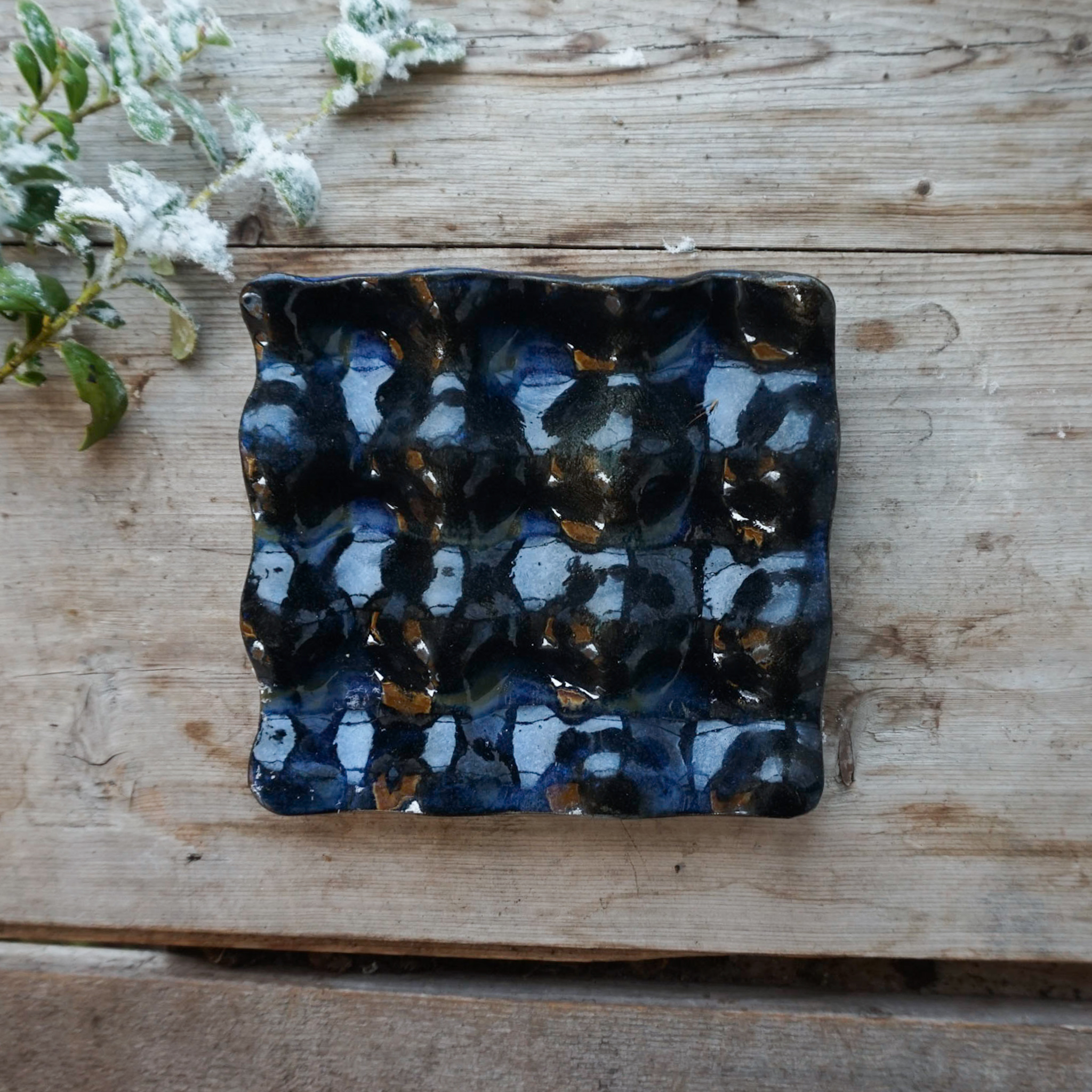 Djupblå- Effektglasyr som kryper ner i ojämnheter och förstärker strukturer. Vid tunn glasering blir den mörk mot svart och där den lägger sig tjockare en djupblå färg. Läcker på saker med struktur!