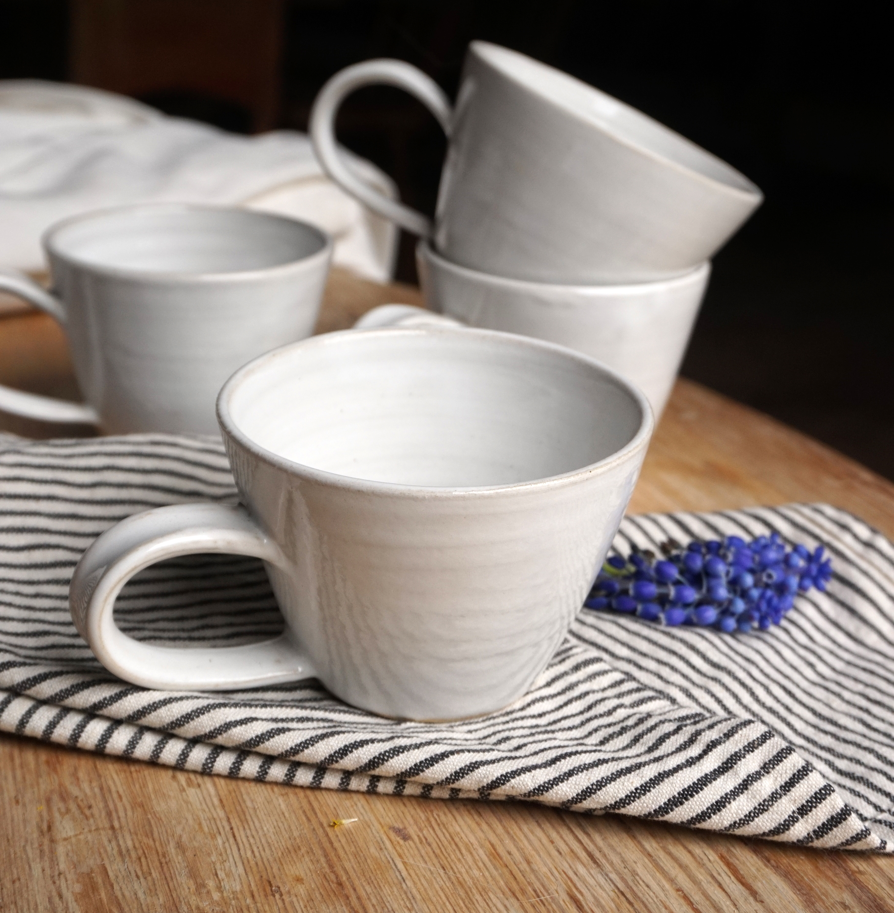 Grå melerad- tokfin effekt glasyr, halvmatt. Kryper ner i drejränder, strukturer och förstärker dessa. Vid tjockglasering slår den över mot ljusblå.